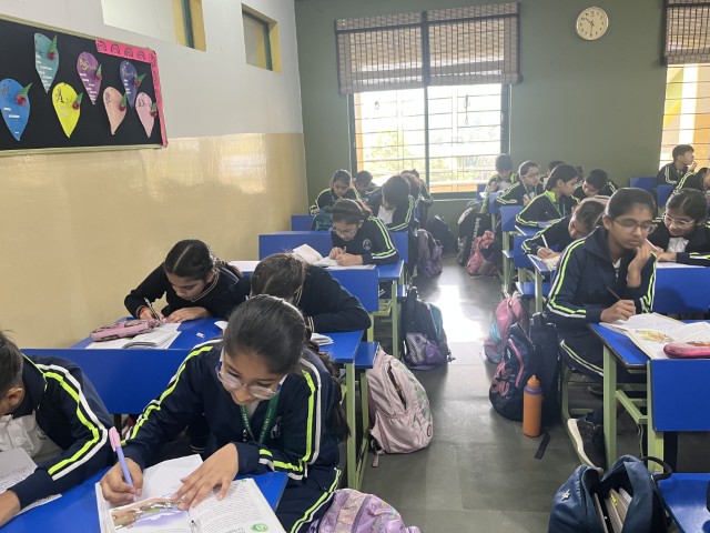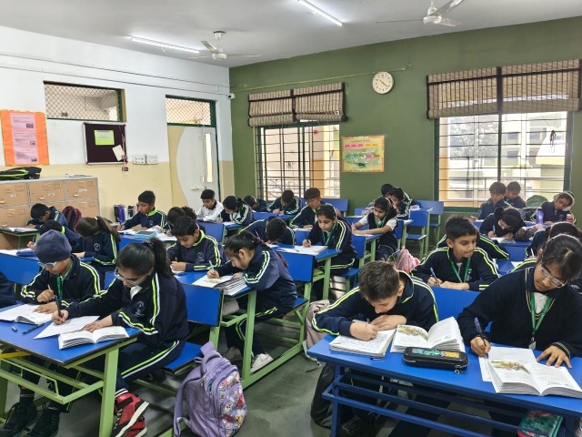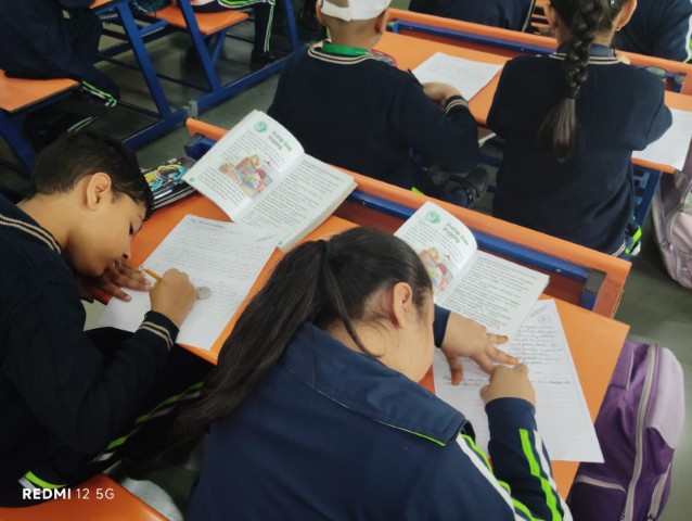 This was followed by an English handwriting activity in which students copied a selected extract from their books. Since a similar task was conducted at the beginning of the session, the activity helped observe improvement in handwriting and presentation.