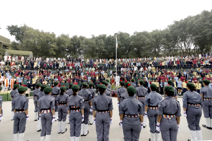 Students then gathered at the Velodrome for the cultural programme . Just before the flag hoisting ceremony, a disciplined and impressive parade by the NCC cadets was conducted, filling the atmosphere with pride and patriotism. The celebrations commenced with the welcome and introduction of the event, followed by the flag hoisting by the Principal along with the guests —Ms Annapurna Patidar, Ms Geeta Patel, Mr Lakshminarayan Pawar, and Mr Rajesh Waghmare . The National Anthem was sung with pride, and everyone took the Pledge, reaffirming their commitment to the Constitution and the nation.