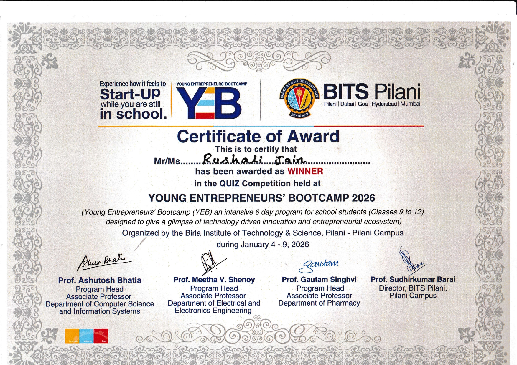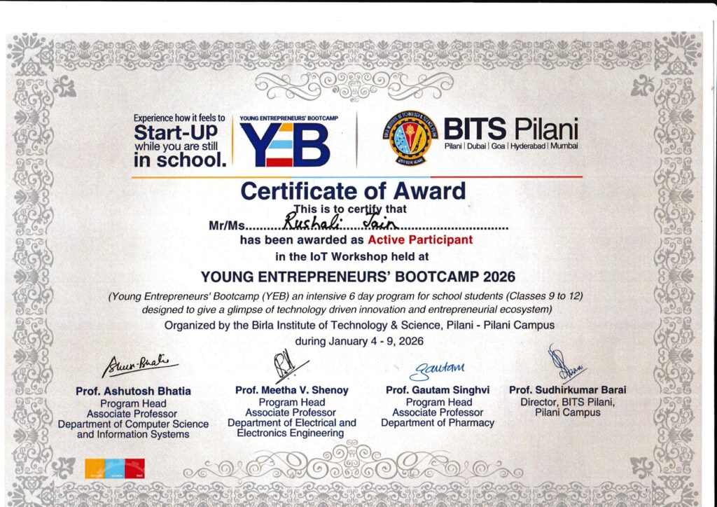 Heartiest Congratulations to Rushali Jain of Class IX A for being  selected for the Bootcamp held at BITS Pilani, Pilani Campus from January 4th to January 9th, 2026, through a rigorous multi-stage selection process that included a portfolio screening round, personal interview, and group debate. From a large pool of applicants, only 120 students were selected.