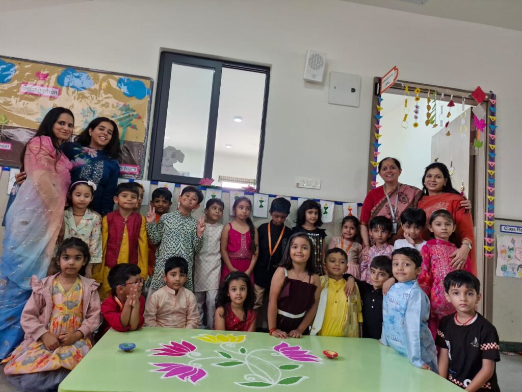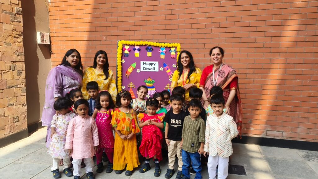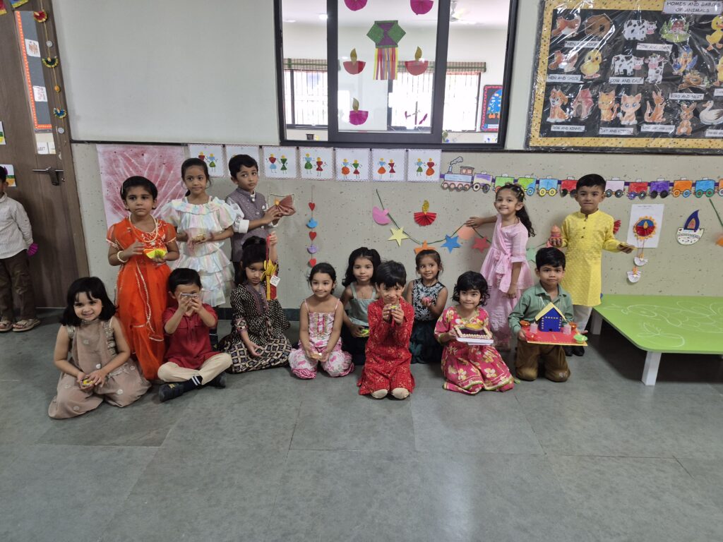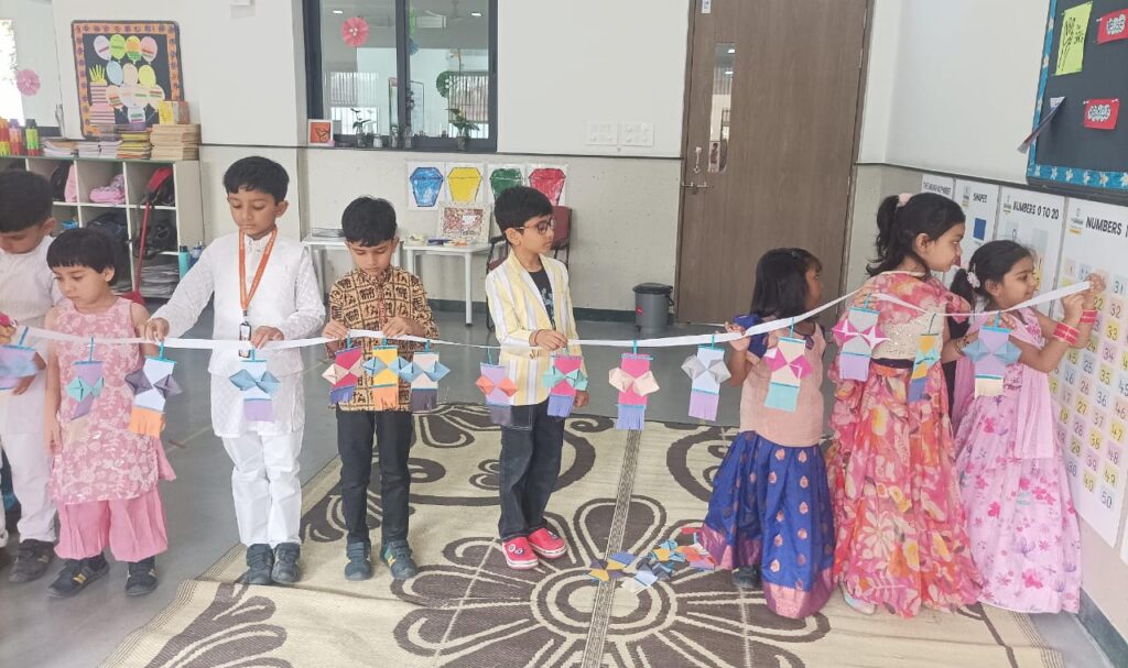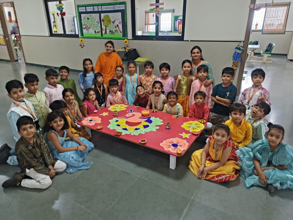 A special cleanliness drive was organized to emphasize the importance of keeping our surroundings clean and tidy.The students participated enthusiastically in cleaning their classrooms with their teachers, promoting the spirit of cleanliness and teamwork. Thereafter they decorated their classrooms with colourful handmade decorations, adding to the festive atmosphere. They showcased their creativity by making vibrant rangoli designs, which further beautified their classrooms, transforming them into festive spaces.