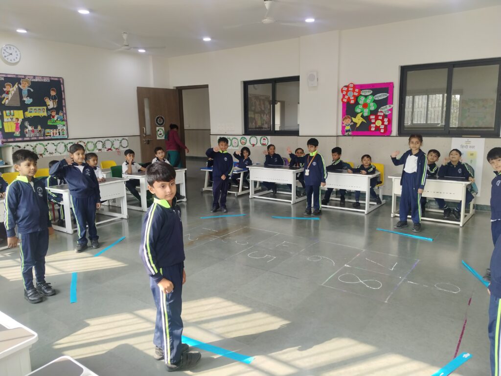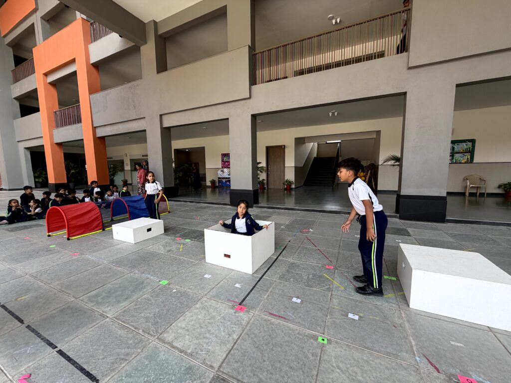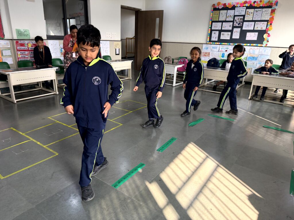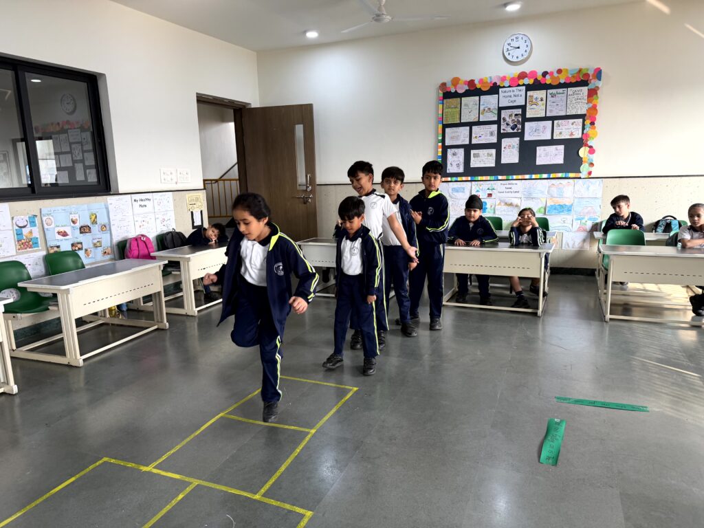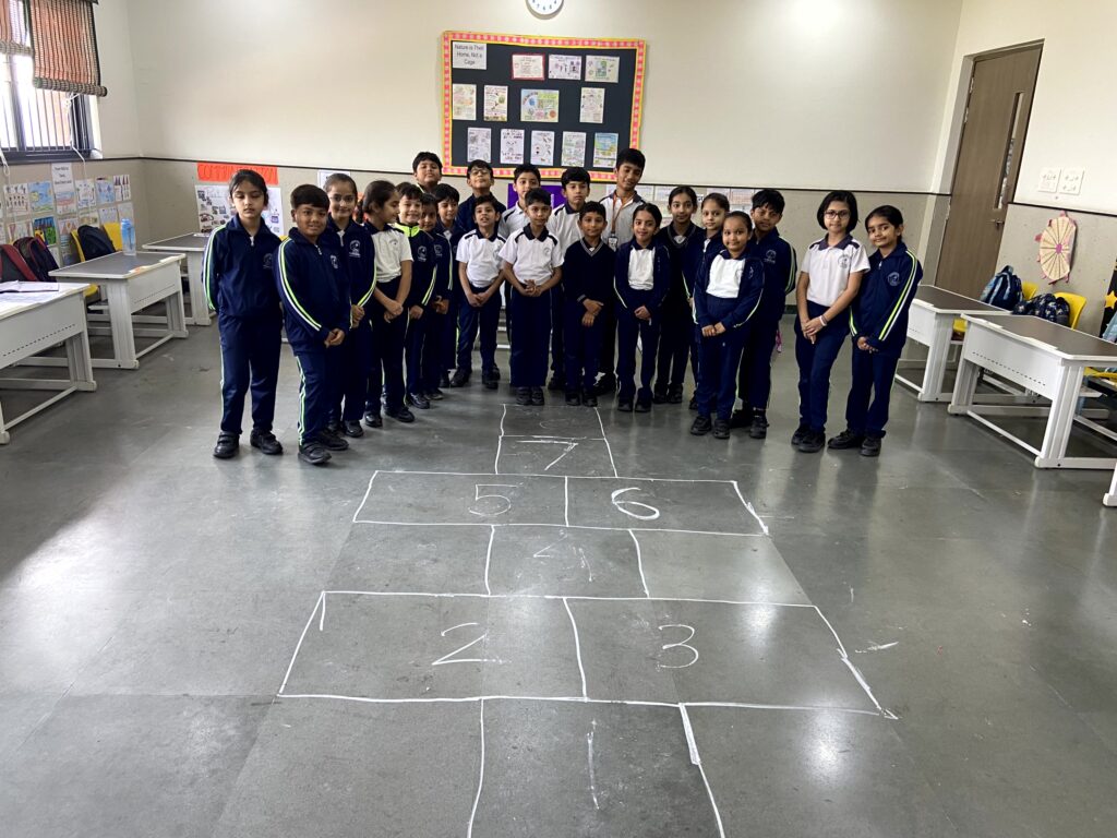 English Day in Classes I and II featured joyful language activities. It kicked off with a Musical Parade: kids circled to music, stopped on jumbled sentence strips, and rearranged them amid laughter and curiosity. Next came Hopscotch Thinking, where hopping on numbers prompted questions on reading, vocabulary, and grammar sparking confident, creative responses. Class I Shishyans also attempted a Prepositions Obstacle course, using words like in, on, and under for fun, physical learning. This combination of sporty activities and language enhancement games added spark and zeal to learning.